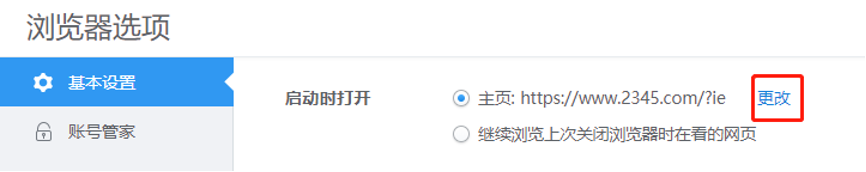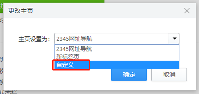 3、点“更改”后,会弹出更改主页的设置框,在这里一共有3个选择,分别为:2345网址导航、新标签页、自定义。