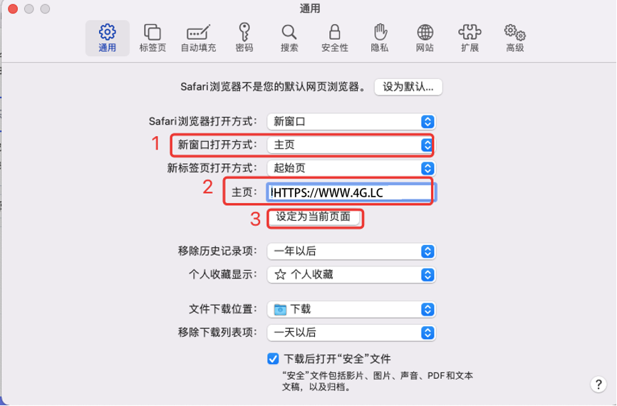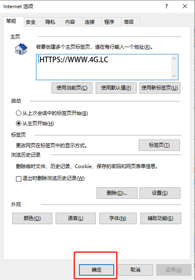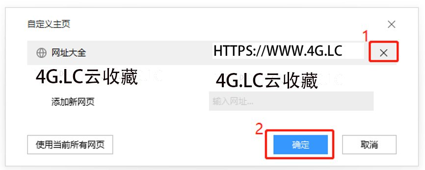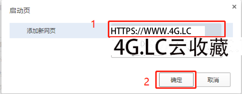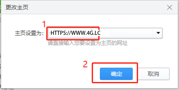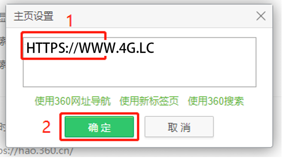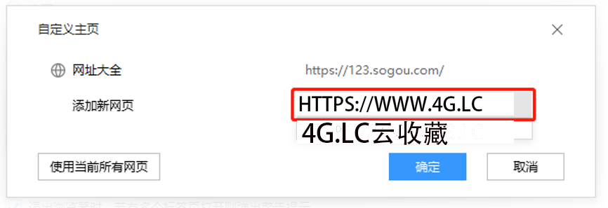 5、在自定义网页设置中,输入默认打开的主页网址,比如www.4G.LC,点击”确定”,如图所示