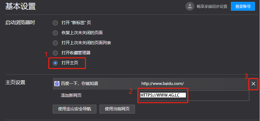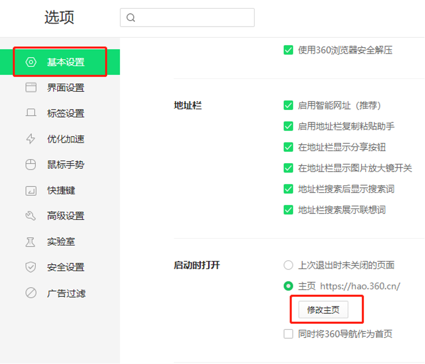 3、进入设置界面可以看到“基本设置”选项这里有一个“主页设置”。把主页设置为你想要的网址。然后设置浏览器启动时选中“打开主页”。