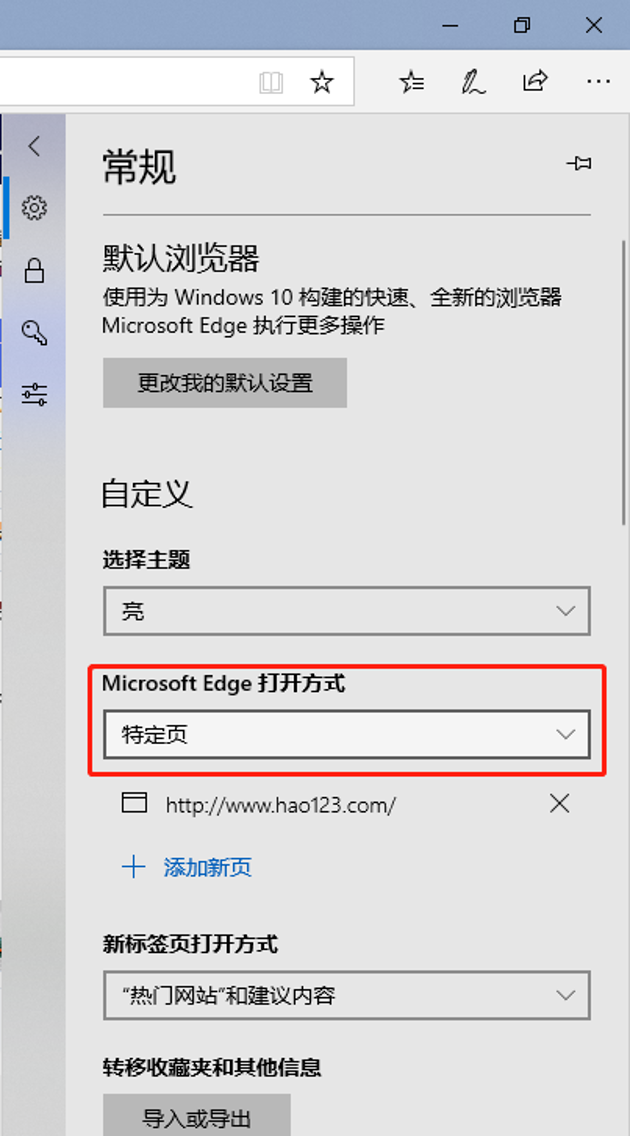 4、进入“设置”选项,找到“Microsoft Edge打开方式”,选择“特定页”