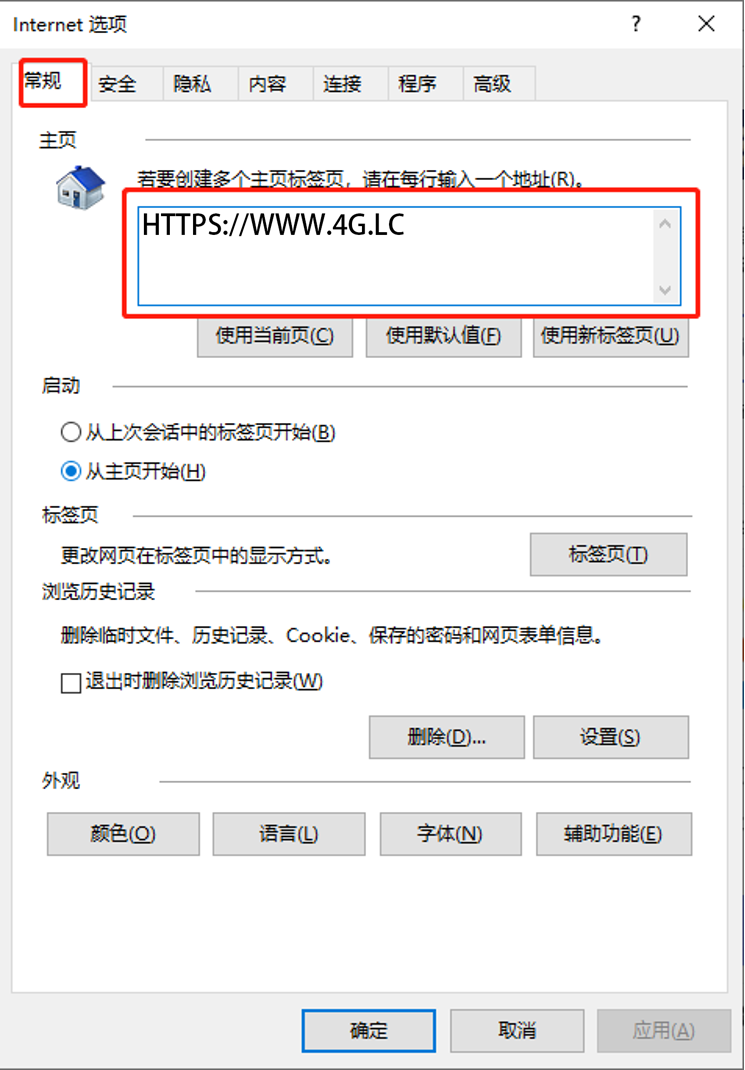 3、在“常规”—“主页”的方框中输入你想设置的网址,如图:
