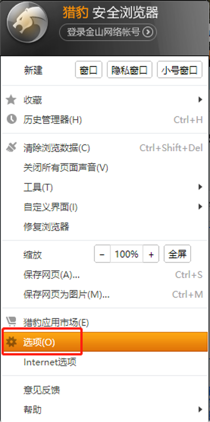 1、打开浏览器,点击左上角猎豹图标